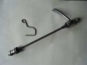 BOB Schnellspanner für den YAK/IBEX, daneben ein Sicherungssplint mit dem der Trailer auf der Achse befestigt wird.