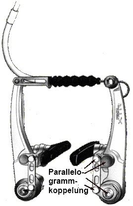 Shimano XTR Bremse. Die beiden Bremsarme stehen hier senkrecht nach oben. Unten sind sie auf den Cantisockel geschraubt und oben über den Querzug miteinander verbunden.