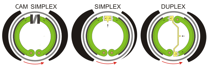 Drum brake types. The black crescents outside the drum are graphs of the pressure of the brake shoes against the drum.