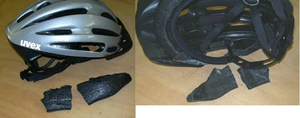 Microschalenhelm nach Sturz. Man kann schön erkennen, dass die Aupfprallenergie durch das EPS aufgenommen wurde und zum Bruch führte.