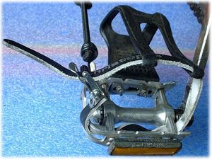 Ein Pedal mit Pedalhaken und Schuhriemen